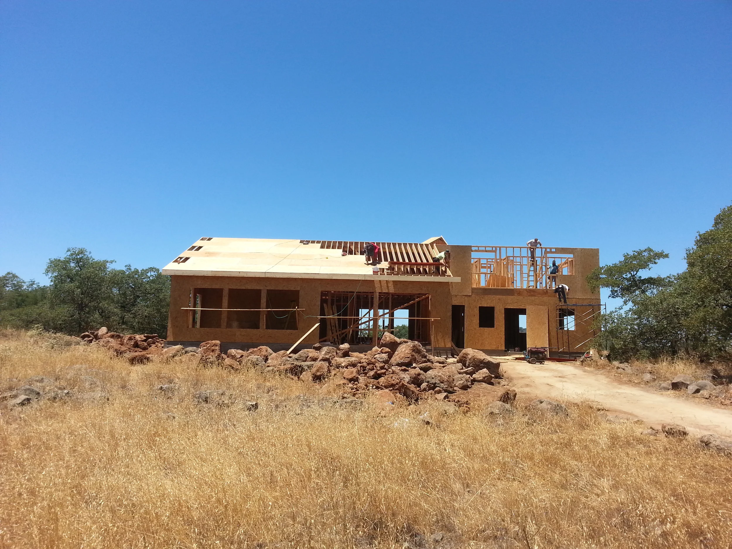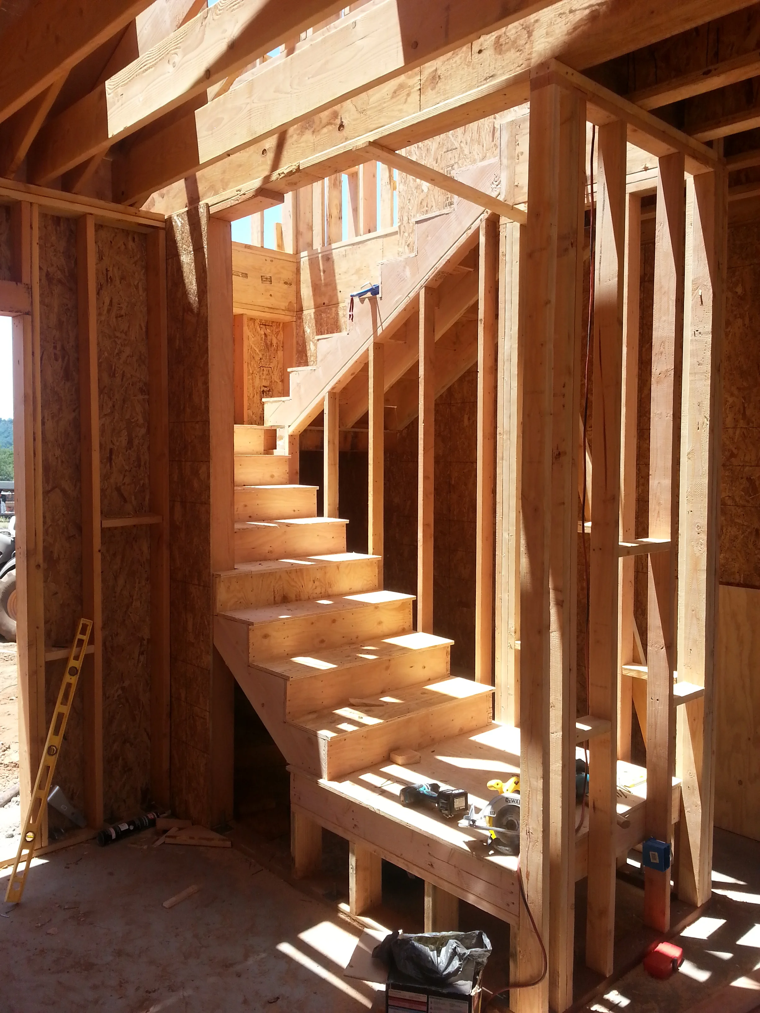 The last three days have seen some exciting changes. The stairs are complete except for the first two steps and the second floor is framed and sheer paneled. The trusses for the second floor are up on the walls but not in place. The roof for the first floor is completed and the correct metal bracket for the main beam on the first floor has been installed! Tomorrow morning (Saturday) Dave Key is coming out to help install the recessed can lights and the remaining electrical boxes! We may also be able to drill the remaining holes and maybe even pull some wire! Exciting I know! You all wish you were so lucky too! ;)